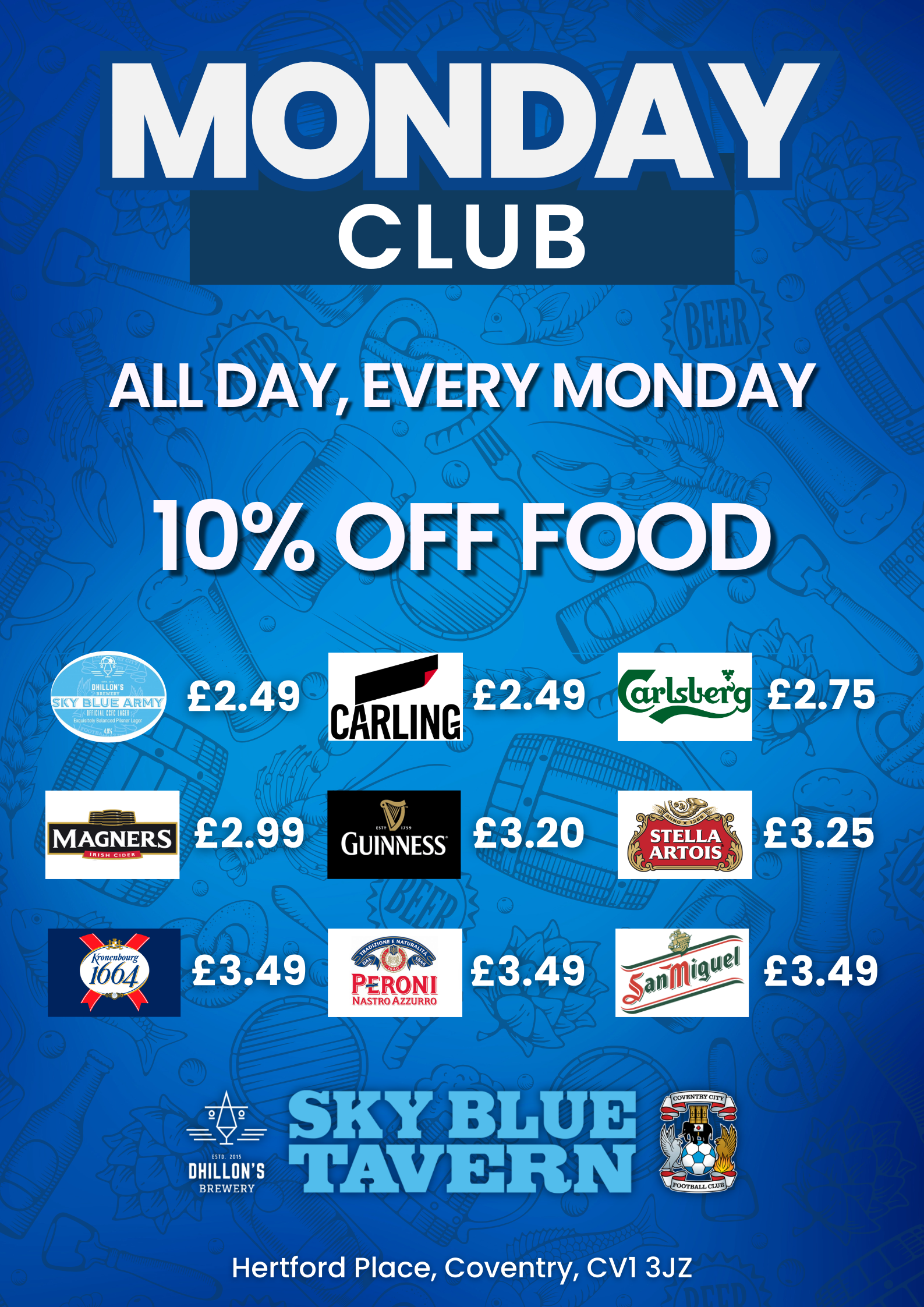 Enjoy 10% off all food and fantastic offers on selected spirits, all day every Monday!